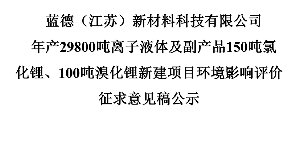 藍(lán)德(江蘇)新材料科技有限公司 年產(chǎn)29800噸離子液體及副產(chǎn)品150噸氯化鋰、100噸溴化鋰新建項(xiàng)目環(huán)境影響評(píng)價(jià)征求意見(jiàn)稿公示